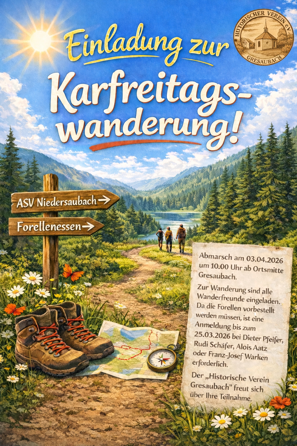 Der Historische Verein Gresaubach e. V. wählte in seiner Mitgliederversammlung am 30.01.2026 folgend Vorstand für die nächsten zwei Jahre: (von links nach rechts): Rudi Schäfer (Projektleiter), Dieter Pfeifer (Stellvertretender Geschäftsführer), Alois Aatz (Stellvertretender Projektleiter) und Franz-Josef Warken (Geschäftsführer).